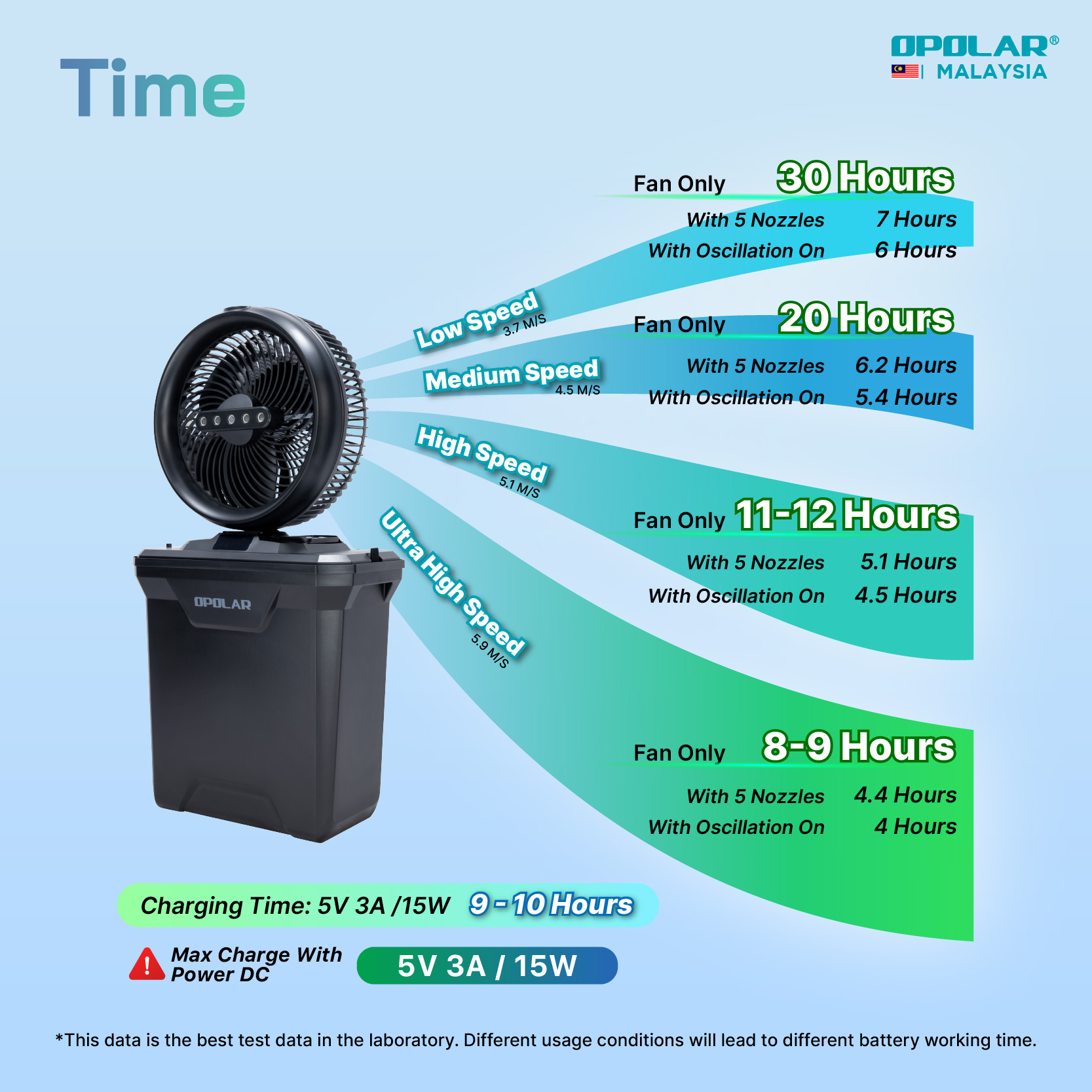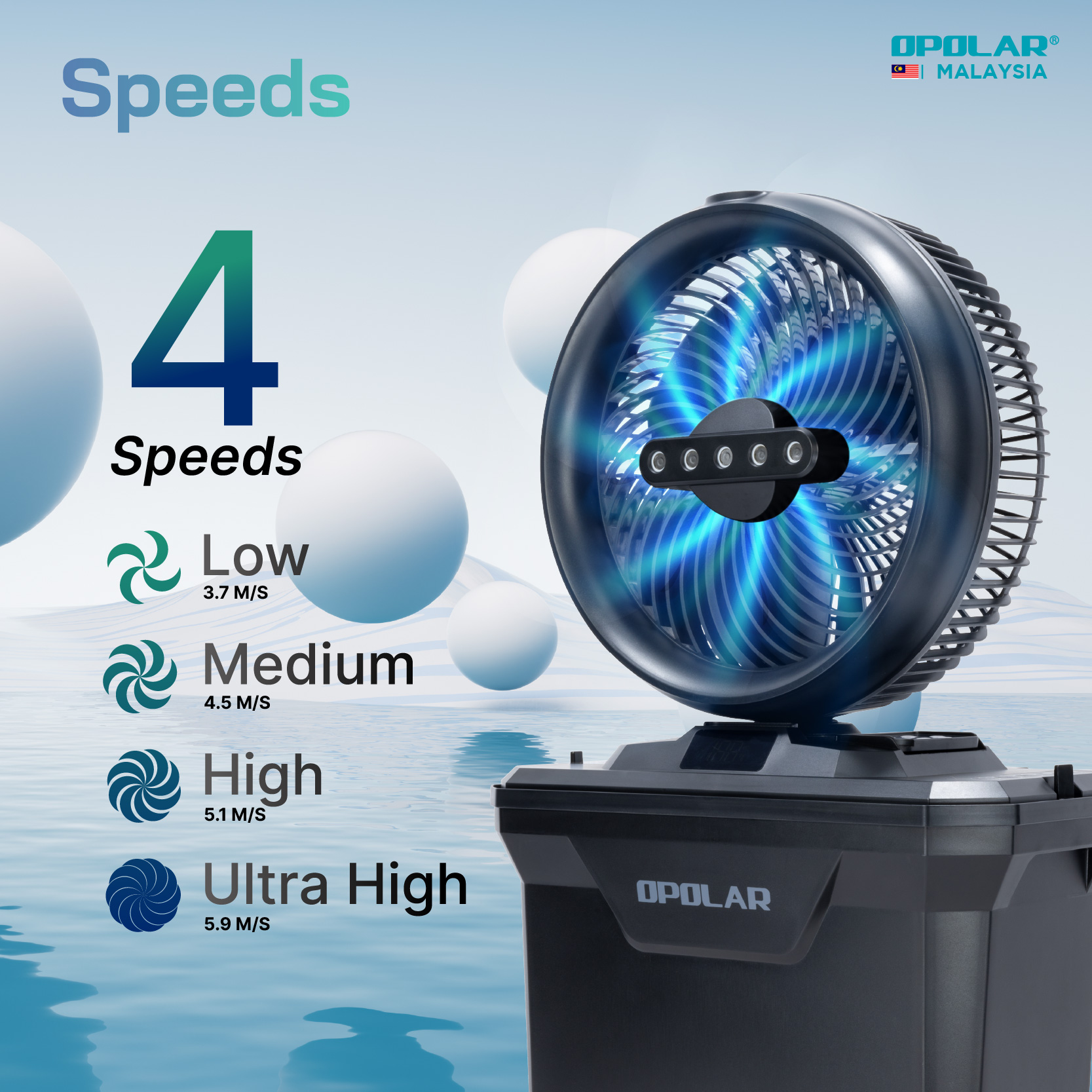 The newly designed OPOLAR misting fan comes with an 11L large-capacity water tank, providing long-lasting and rapid cooling mist. You may activate 1, 3, or all 5 nozzles depending on your cooling needs—using more nozzles increases water consumption but delivers a stronger cooling effect. The misting function is optional, and the fan can be used without mist. During operation, place the water intake hose at the bottom of the tank and fill the tank with water.