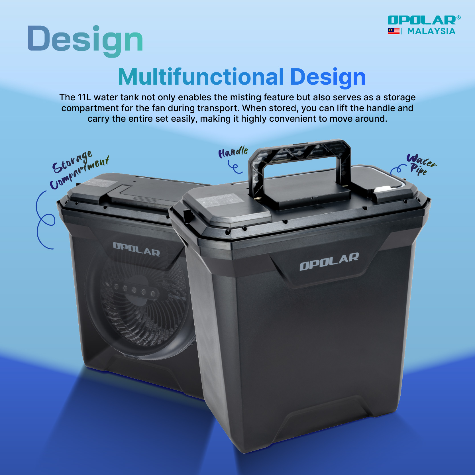 The 11L water tank not only supports the misting function but also serves as a storage compartment for the fan during transport. When stored, you can lift the handle and carry the entire unit easily, making it highly convenient to move around.