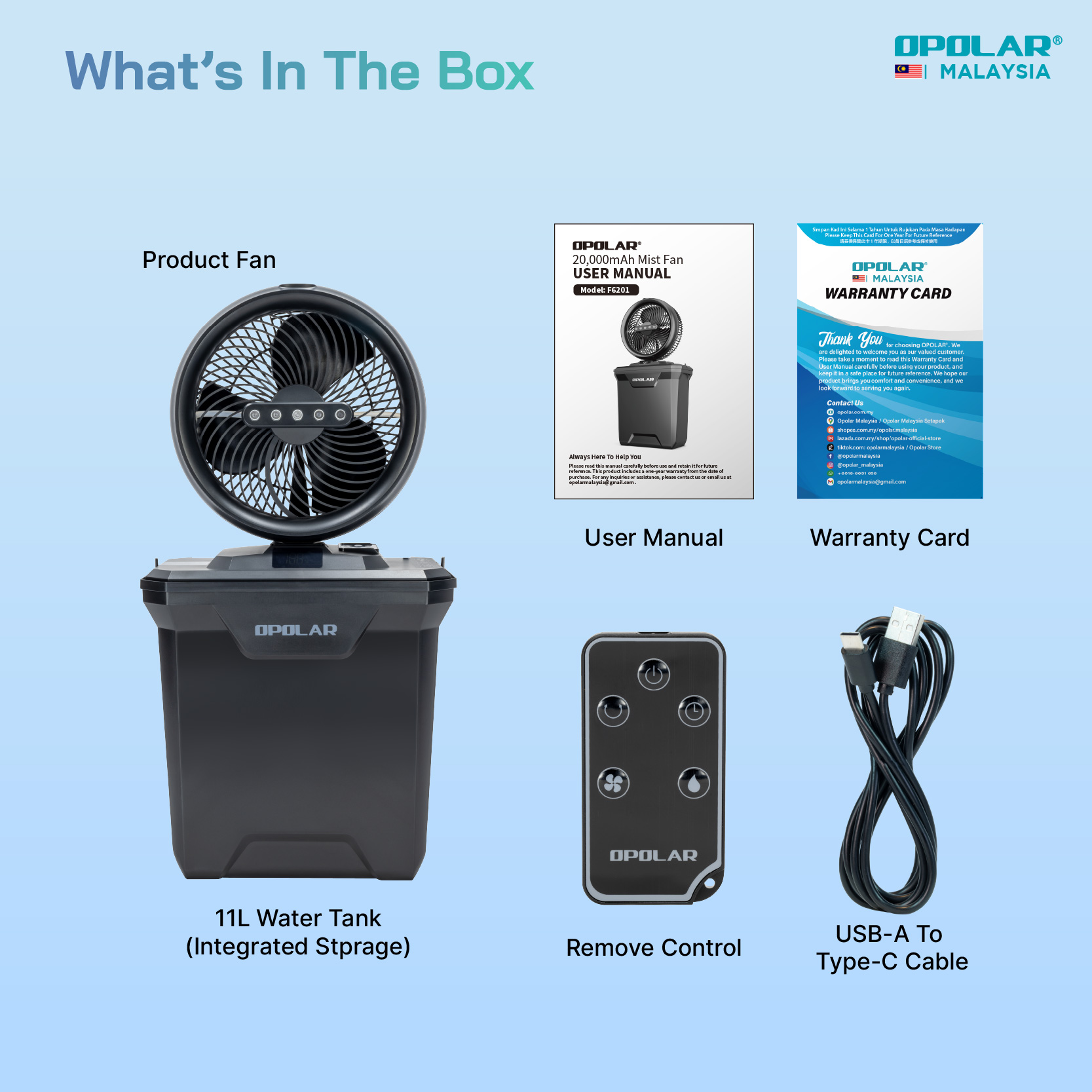 Product Fan (Upper Part), 11L Water Tank with Integrated Storage, Remote Controller, USB-A To Type-C Cable, User Manual, Warranty Card.
