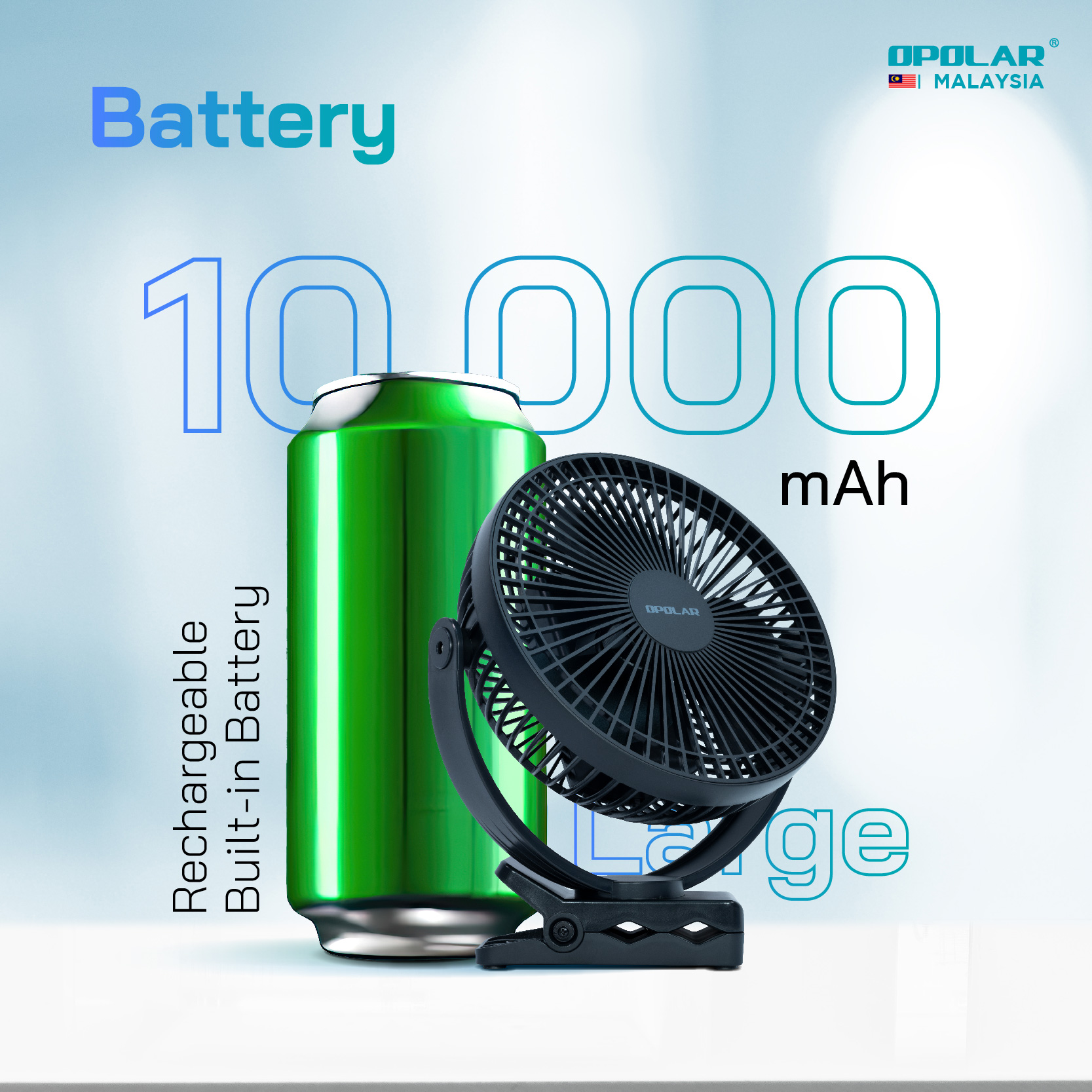 This portable outdoor / indoor clip on fan is configured with a long-run durable 10000mAh polymer battery with USB-C charging ports for 2A fast recharging.