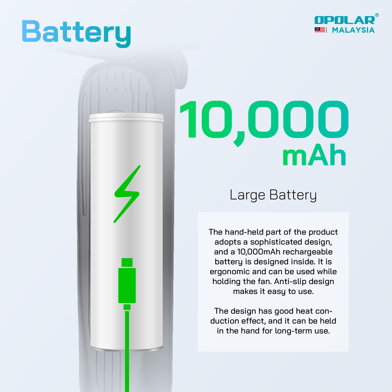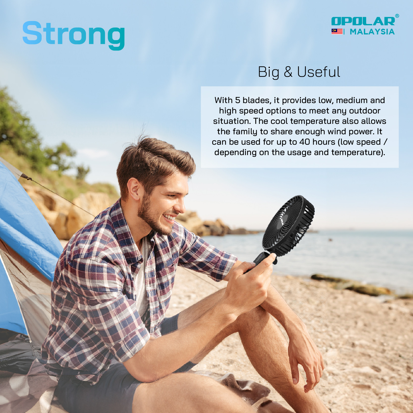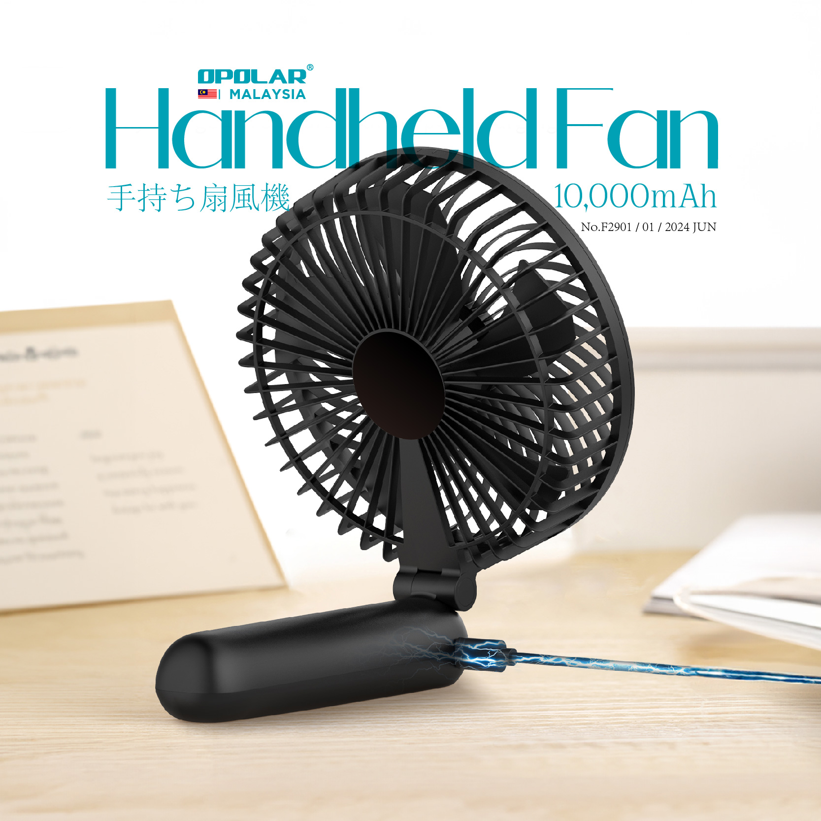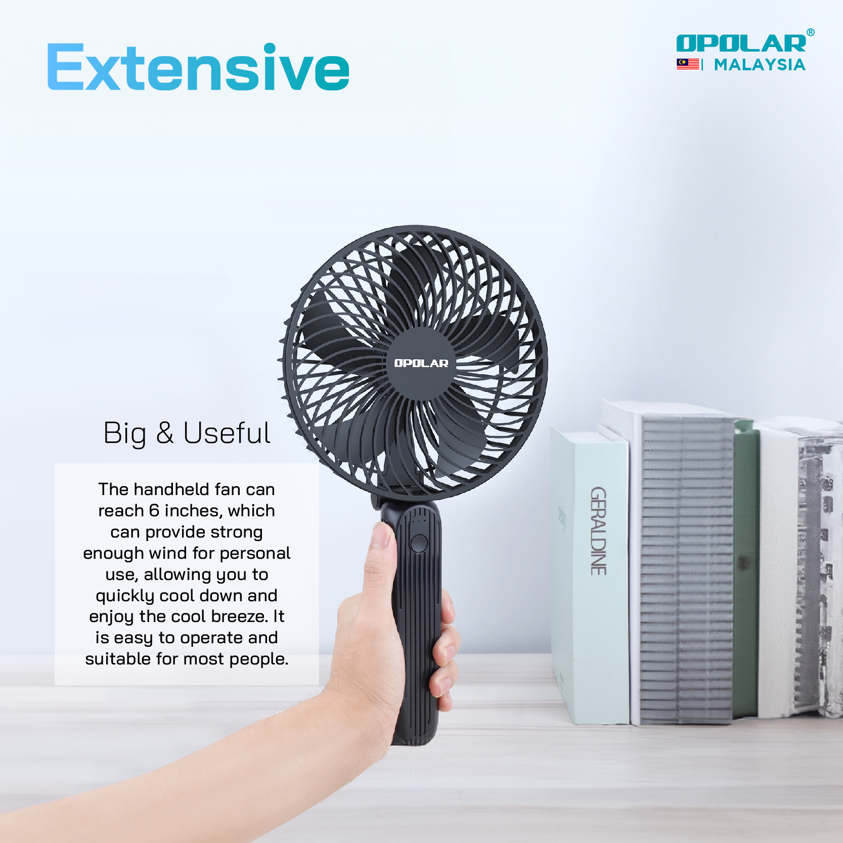OPOLAR launches the newest and the biggest handheld fan in the market. Unique design with 5 blades and 6 inch frame could produce much more airflow, which covers a larger area compared with the little pocket face fan.
