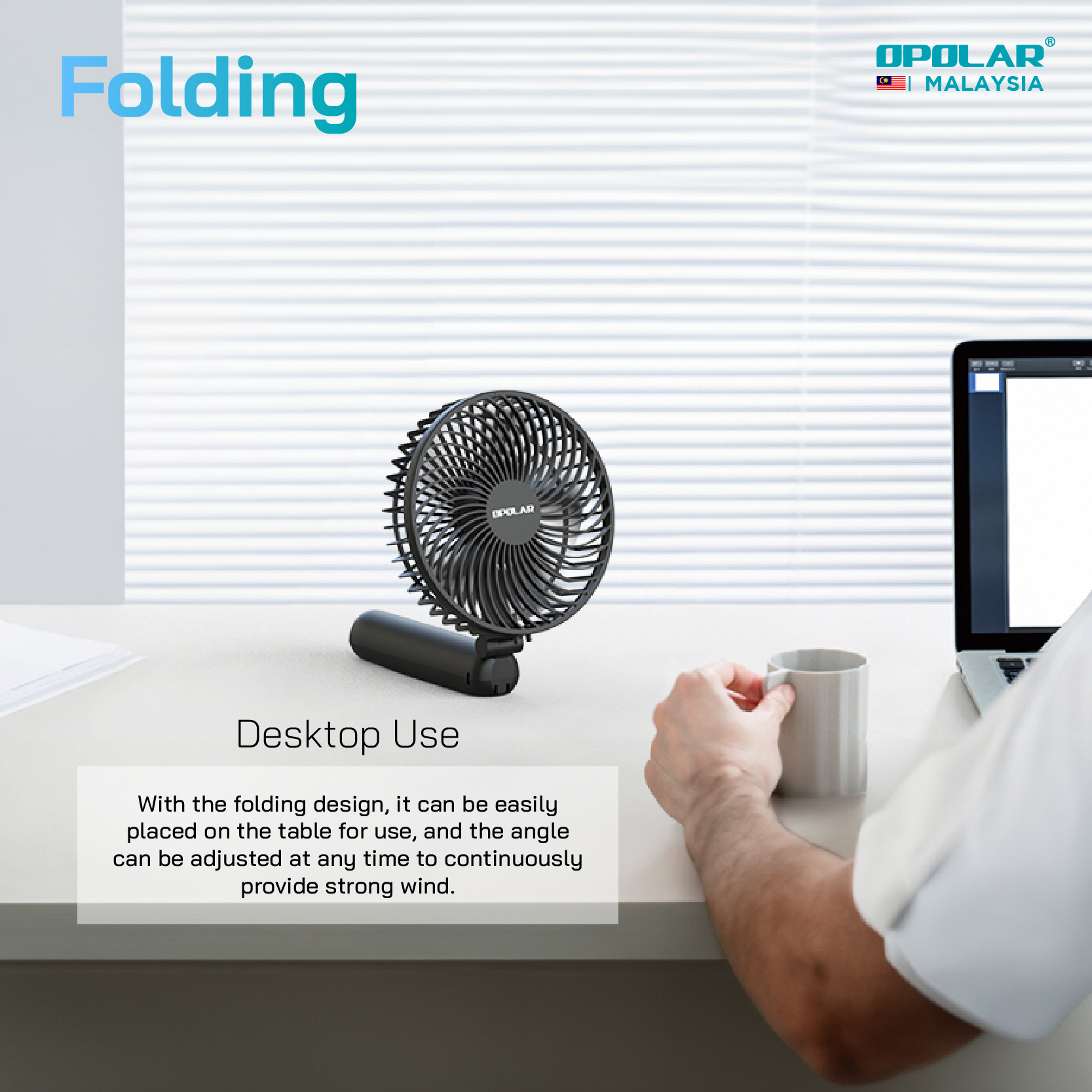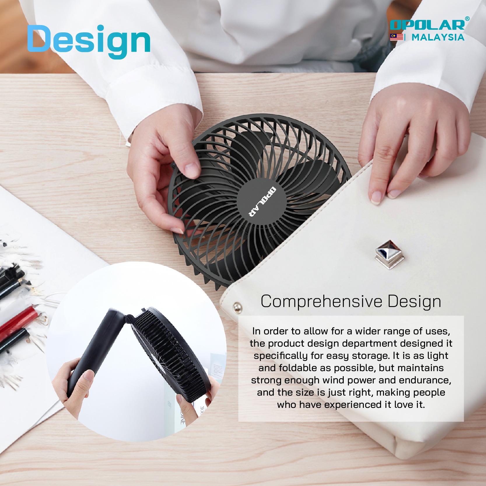 The foldable design makes the fan easily to be put into a bag. However, the most great feature is to fold it and put it on desktop as a desk fan. One fan for dual purpose.